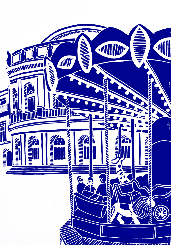 Linogravure originale, numérotée à 50 exemplaires et signée. Cette œuvre est un tirage artisanal; sur le tirage papier peuvent apparaître quelques imperfections dues à l'encrage et au pressage à la cuillère. Tirage 30x40cm disponible en bleu, orange ou noir.